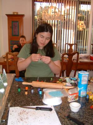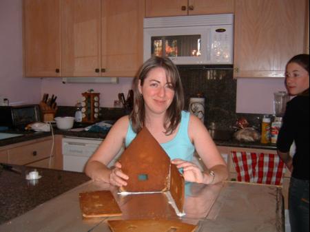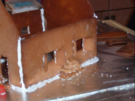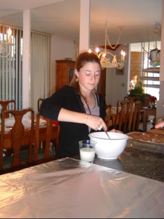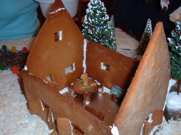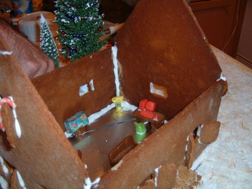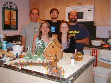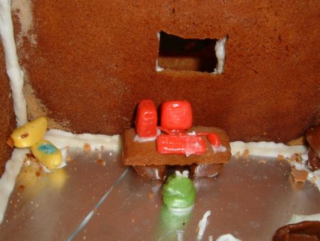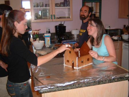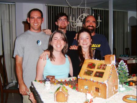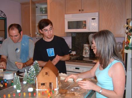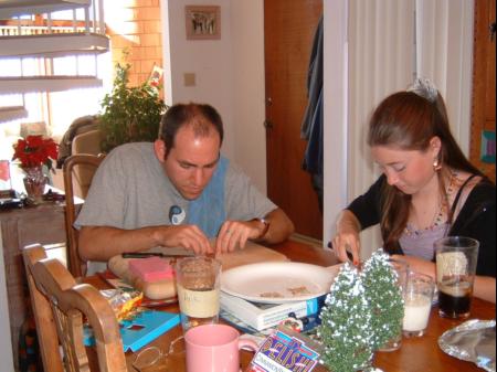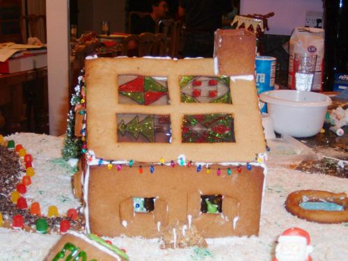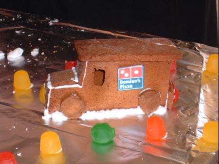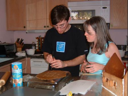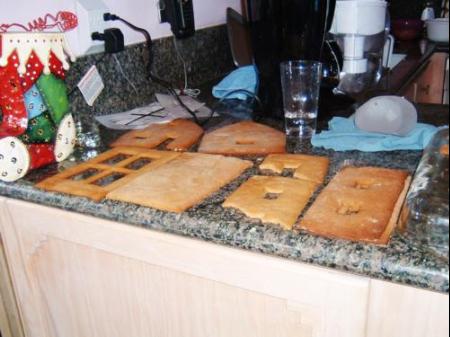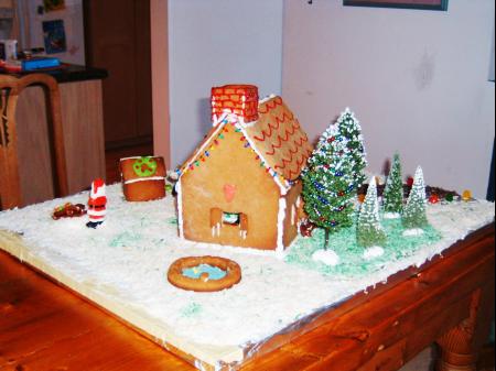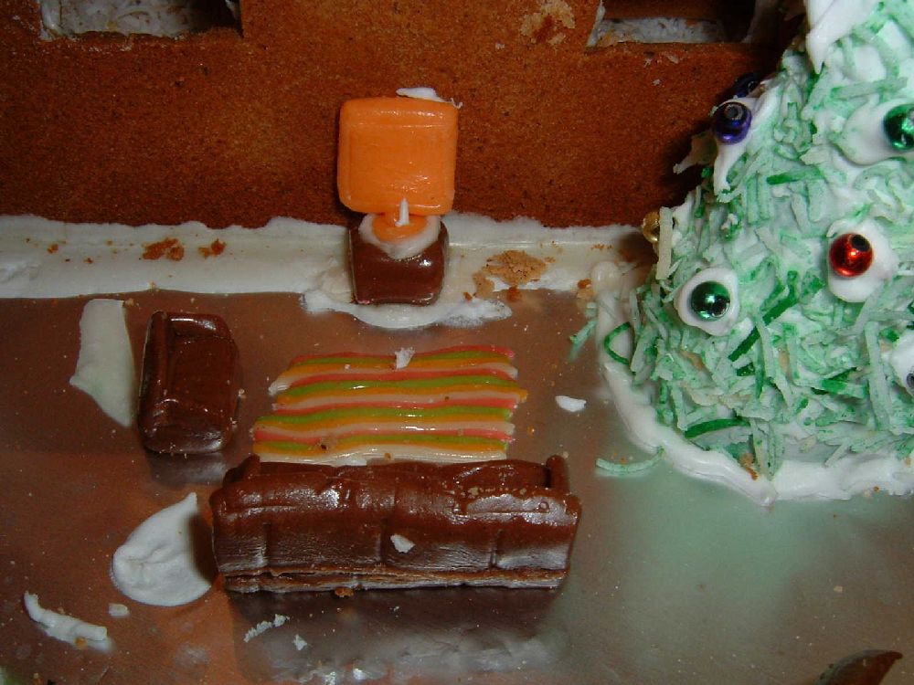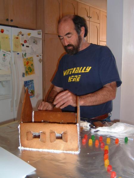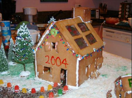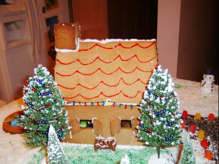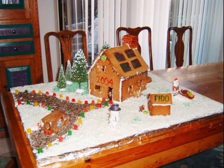 We have made gingerbread houses for about 7 years from 1992-1998. We took a break for a few years and here we are again, starting up the tradition. The house itself is made from special gingerbread that is harder and tougher than normal gingerbread. Most of the other accouterments are made from carved candy. Adam made plans for the pieces of the house. Larry baked the pieces the morning of Christmas Eve. When they cooled the process started. As you can see, the whole place is decorated. Pieces are held together by a glue made from powdered sugar and egg whites. It is exceptionally gooey and dries quickly. The house sits amidst snow (white coconut) with a circular driveway (colored coconut) that is flanked by candy drops. There is a Domino’s truck in the driveway bringing the traditional Christmas Eve pizza. To the left of the house sit 5 trees on a lawn made from dyed coconut. The two larger trees are decorated for Christmas. To the front and right sits a snowman. Behind him there is a doghouse with Fido, the faithful pooch and his food bowl. In the back you can see Santa and his sleigh. In the back (not in view) is a swimming pool complete with diving board and a duck. The house itself has shutters on the windows, a log pile, and is complete with furniture. This year’s model has a kitchen table and chairs with flowers on the table. There is also a couch with a rug, a computer on a computer desk, a toilet (that’s Adam’s work) and a fishbowl with fish. Give credit to Adam and Kaylee. This is their work. The house itself has a stained glass roof, lights made from a necklace and various decorations. Since this is snow country, there are icicles all around. Below you will find pictures of the entire process. Enjoy! We sure did.