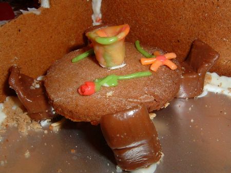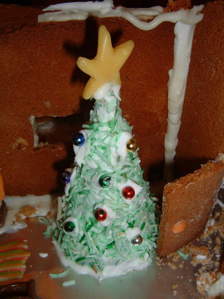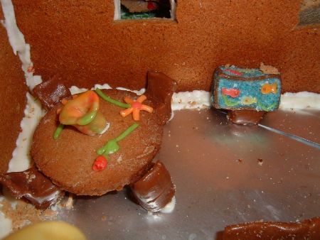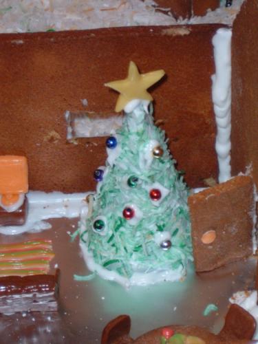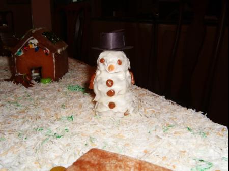 This snowman was a bit droopy. The top hat, although difficult to see, was a nice touch. The arms, made of tootsie rolls droop by the snowman’s sides. No tootsie roll stuff next year. We’ll have to try something else.