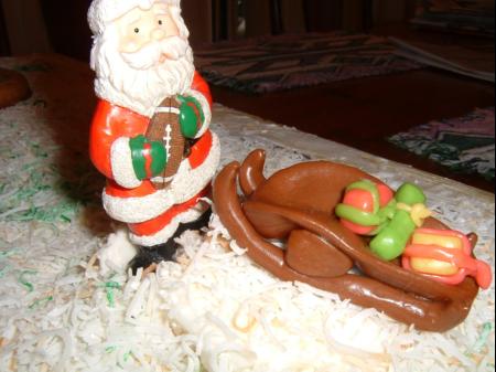 Here is Santa’s Sleigh complete with toys all of which was molded from candy. Well, all but the Santa who inexplicably is holding a football. Carol crafted the sleigh from tootsie rolls and other candies.