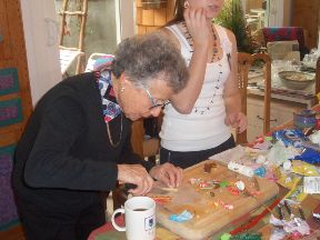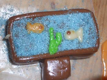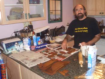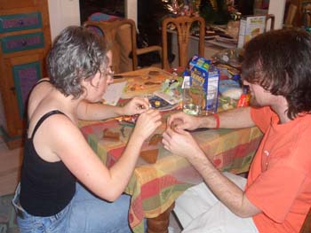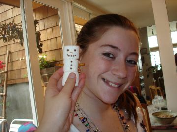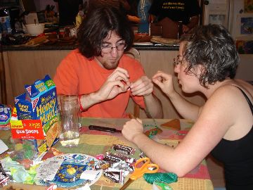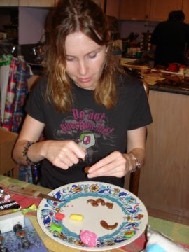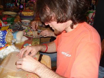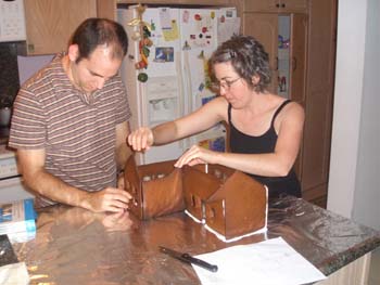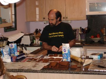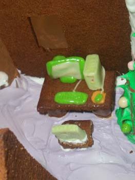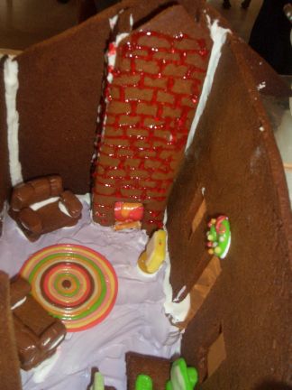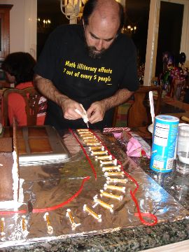 Here it is in all of its splendor and glory! The pictures that follow trace the entire process and also show you what wonders there are on the inside of the house. The project is truly a group project. Everyone gets to do whatever tickles their fancy. Some love to mold candy in to furniture or animals. Others thrive on making things for the outside of the house like sleighs, trains and snowmen. Still others enjoy the structural aspects. By the way, Adam designed the entire house, mailed it to Larry, who pre-baked the house pieces. Then during the construction days other pieces are baked as needed. The dough is a special gingerbread dough that is stiffer than normal gingerbread so that the pieces retain their shape. Not the same as eating gingerbread but many of us munched on the broken pieces! In preparation for the construction we bought lots of different candies to stimulate our imaginations. The consensus best appear to be tootsie rolls, starbursts, pretzels, candy canes, marshmallows and, for the first time this year, frosted mini-wheats on the roof for that “snowy” look. By the way, this is probably our 10th house in the last 13 years. To the best of anyone’s memory, the original house was designed by Adam and placed on a pizza pan. As you can see, we are far past the pizza pan! This one is on a large piece of plywood, covered in foil. At the end, the entire scene is covered in coconut to simulate snow. Although we can’t seem to find earlier pictures (except for last year), it took a few years to start getting fancy. Then each year some new concepts are added while others fall by the wayside only to reappear in later incarnations. This year saw the addition of a train (Larry’s contribution) and the complete redesign of the house from a one room building to a “studio” with a living room and a separate sleeping area. Who knows what will show up next year?