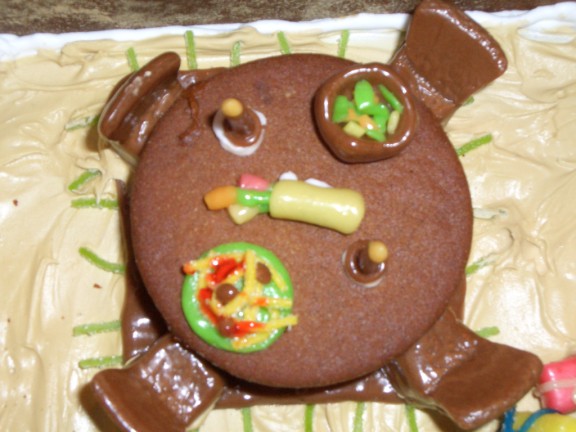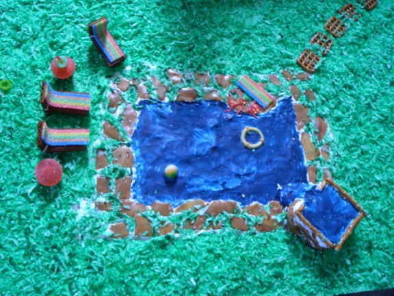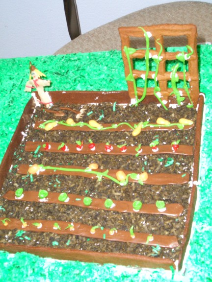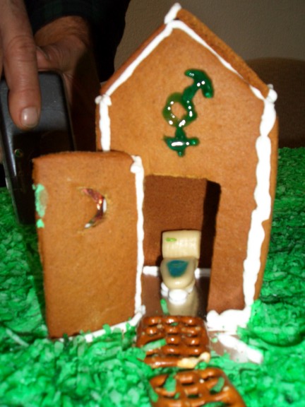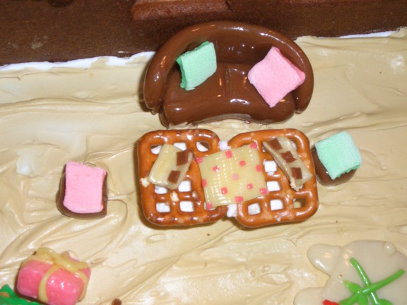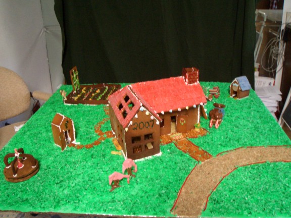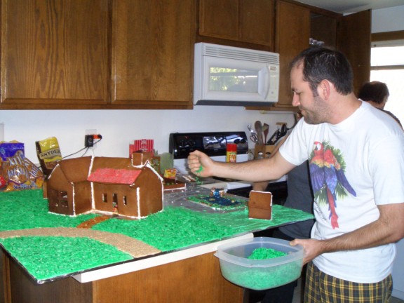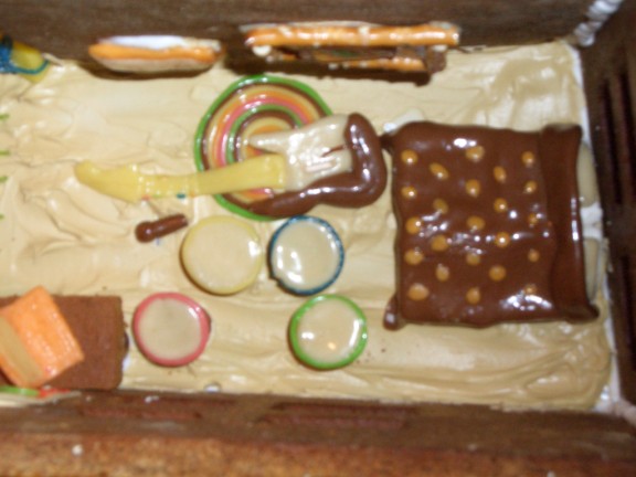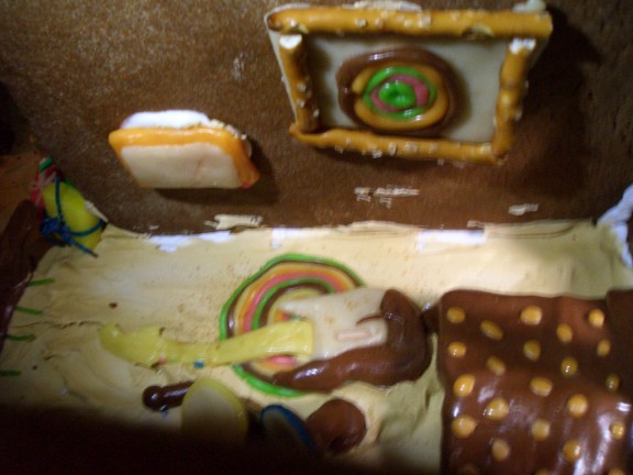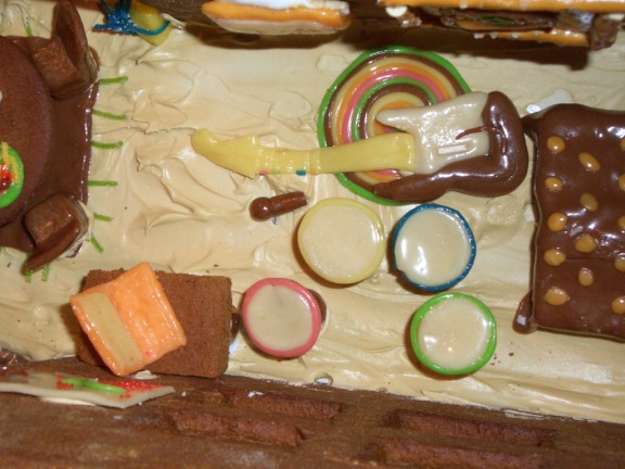 Here we are, late Christmas afternoon, having opened all of our presents, moved the house from the kitchen counter to the dining room table where it will stay until Larry decides he has seen enough of it somewhere in mid- to late January. Don’t we all look happy? Amazing what a few hours of sleep (very few) and a whole bunch of presents will do for our moods! Just as an overview, you can see the house in the middle with a semi-circular driveway (made from dried lentils and edged with red licorice strands) and a walkway to the house made from pretzels. On the left side, in the foreground, are two flamingoes. Behind that is a working merry-go-round and an outhouse. To the right of the house you can see Santa’s sleigh with a sack of presents, but no Santa (more on that later). At the far right is the dog house. Way in the left rear is the winter vegetable garden. From left to right are Arie, Adam, Kaylee, Chris, Vicki and Larry. The rest of this page includes detailed pictures of the process and the final results. Enjoy!