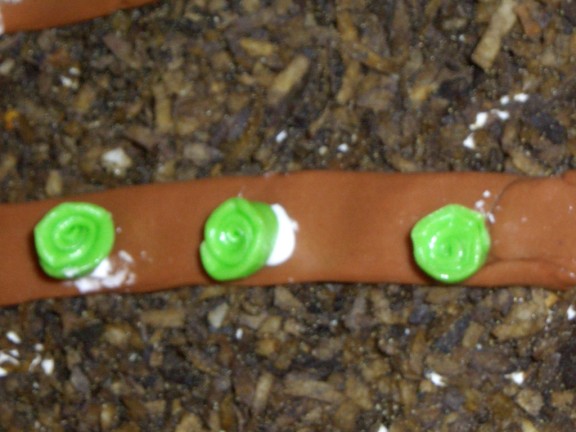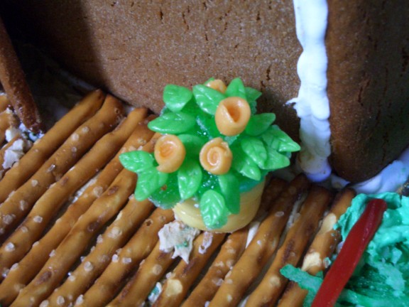 This is a rose bush that Adam did at the last minute. It is nothing short of amazing given that it is about an inch wide! It is sitting on the front porch (made from pretzels), just to the right of the front door. If you look at a photo of the full house you will see how tiny it is. The detail is unbelievable with the leaves even having their veins clearly emanating from the central stalk.