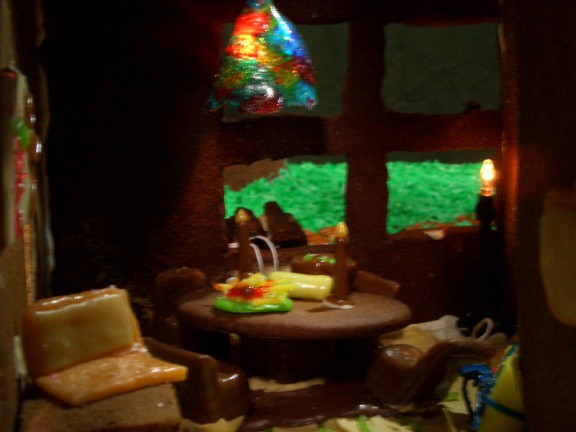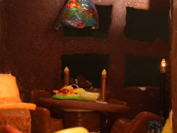 Adam has been trying for years to create stained glass. This year he figured out how to take hard candies and bake them until they melted. Then he cooled them and peeled them off and had what looked like stained glass. He and Doctor Chris decided to take one piece of stained glass and create an amazing chandelier. Chris then carefully poked a whole in the top and inserted a tiny light which was then routed outside the house to a battery pack which lit it up. The same battery pack also lit up the light in the corner. The chandelier sits atop the kitchen table, shedding light on a wonderfully laid out dinner spread.