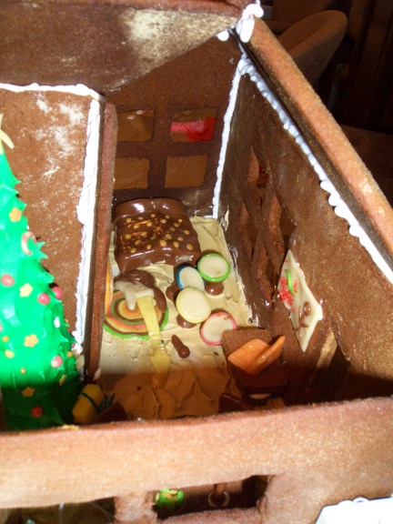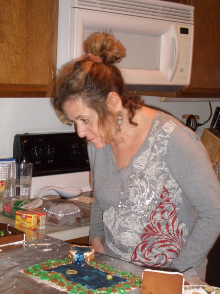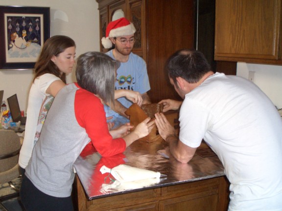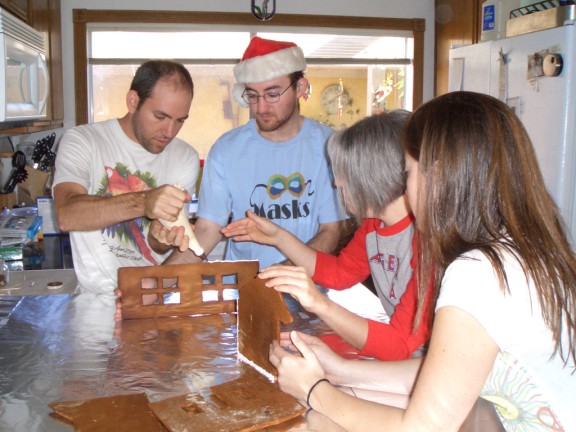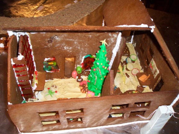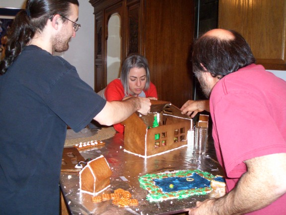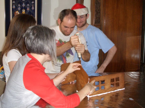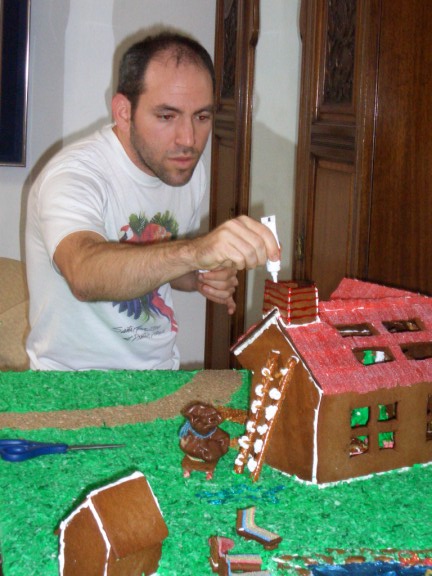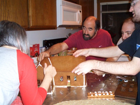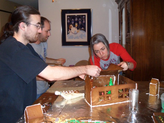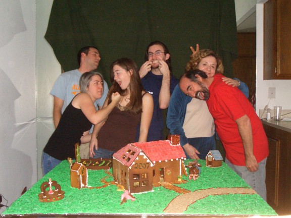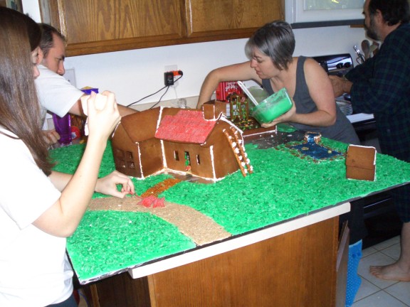 This year we have once again built our traditional gingerbread house. This is a tradition since 1989 (at least we think that it was 1989 because the recipe for the gingerbread and frosting glue came from a newspaper article, now all weathered and yellowed, dated 1989). For those of you who have never seen what we do, basically here it is. WE ARE INSANE! We start with a design for the house which Adam creates and changes every few years. Larry bakes the major house pieces on Christmas eve’s eve (the 23rd) so that they are all ready to assemble on Christmas eve day. Then we put together the main house structure and anyone who wants to participate creates the internal and external environment. The process starts around 10 AM and ends VERY LATE. This year we stopped at 3 AM and picked up and finished the house after present opening on Christmas day.
