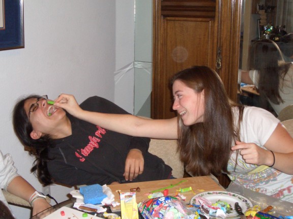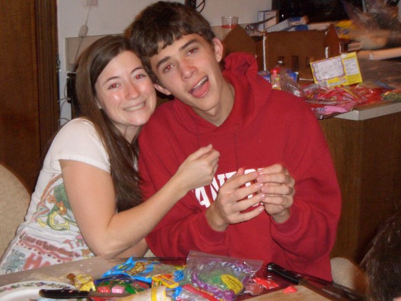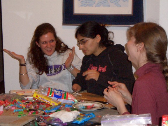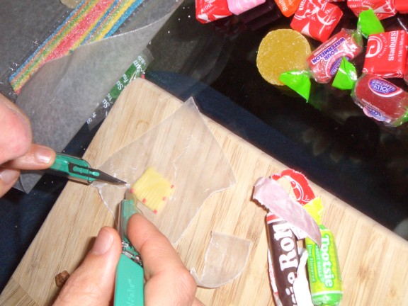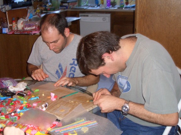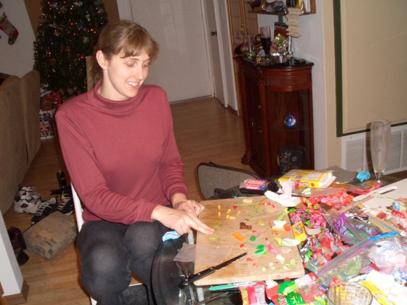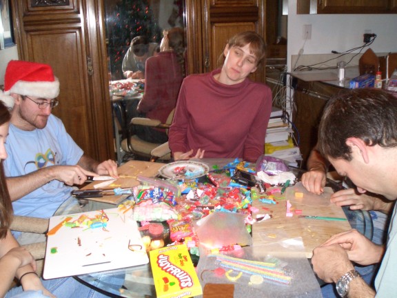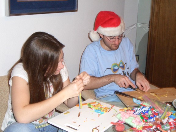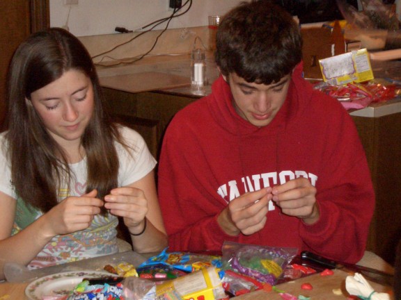 Kaylee and Chris are making something for the inside of the house. Scattered around the dining room table are lots of candies ranging from soft tootsie rolls of various colors to hard candies. Kaylee is playing with something that comes in a flat rope of multi-colored, disgustingly sugary candy. Chris has rolled some tootsie rolls flat and is cutting them. By the way, thanks to the other Chris who “liberated” a set of s and a suture kit from the emergency room where he is is a physician. We offered to give them back and he just laughed and said they would just thrown them away which may explain why our healthcare costs are so high … OK, no more politics for the rest of this webpage … if I can help it.