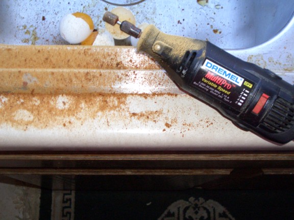 Here is Adam shaving the front wall with the Dremel. You can see the shavings flying all over the place.