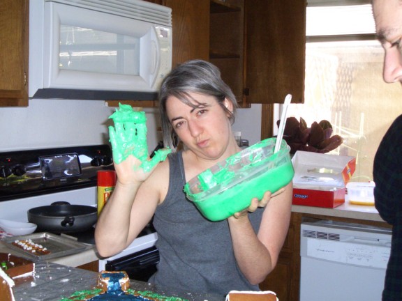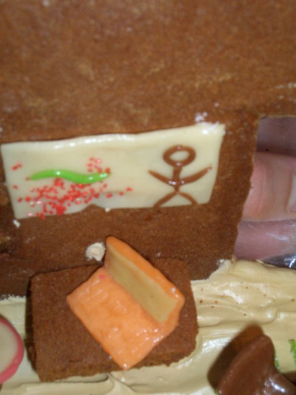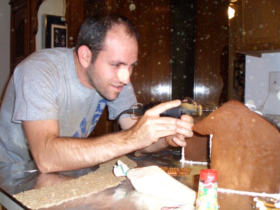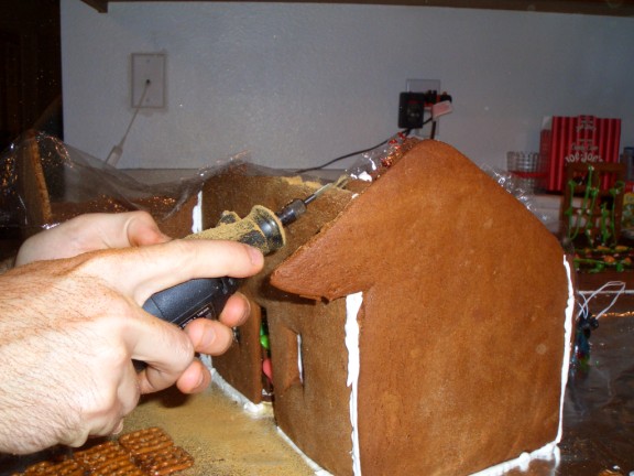 Adam is using a red cake decorating tube to make the chimney appear to have bricks. Too bad Santa never made it up there!