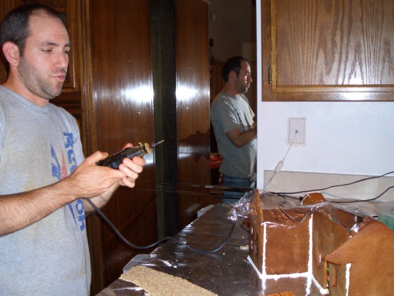 The first step is to put foil on the board. Then the house is located and the pieces are “glued” to the board. The glue Adam is squeezing is a combination of powdered sugar, cream of tartar and egg whites which is mixed until it is incredibly gooey and stiff. It hardens in just a few minutes.