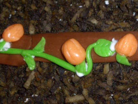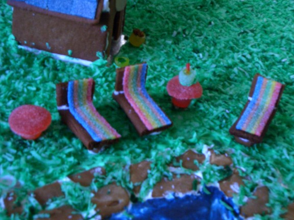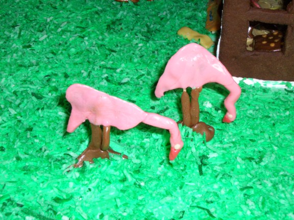 Here are the flamingoes. This was a frustrating exercise since in spite of reinforcing them with toothpicks they kept wanting to collapse. It was kind of interesting to set them up and watch the necks slowly sink to the grass followed by the bodies. Some things are just too darned tough to make with candy. Maybe next year?