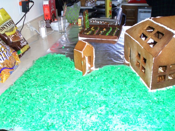 This shows the front driveway (dried lentils) and grass made of coconut dyed green and held down with the “glue” which was also dyed green.. Note also the start of the roof tiles. This year we used some sort of candy that comes in rolls, cut it into pieces, and layered them to look like roof tiles. Quite innovative.