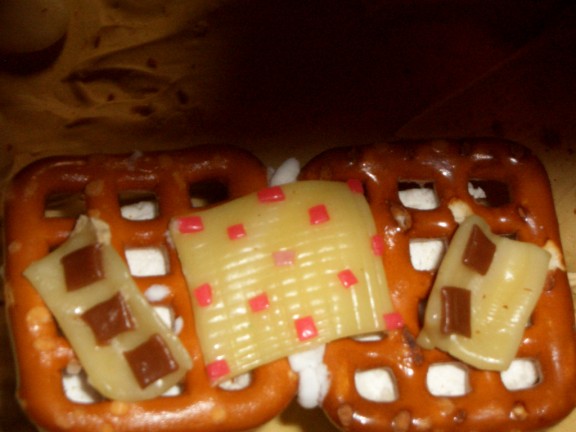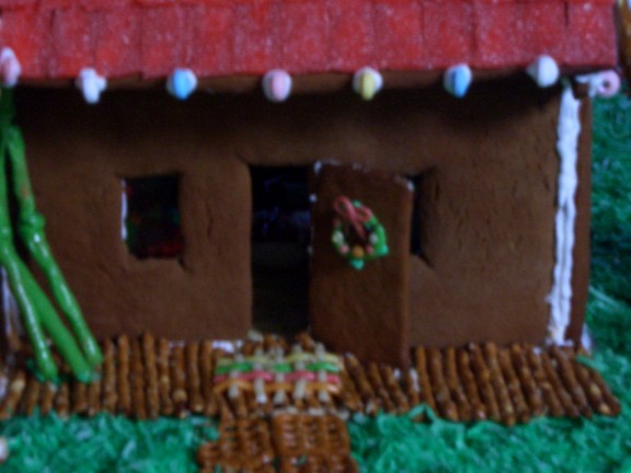 Although this is fuzzy, it shows the front door with steps made from square pretzels, the porch from pretzel sticks, a woven door mat, some bamboo to the left of the door and a wreath on the door. The Christmas lights are made from candy necklaces.