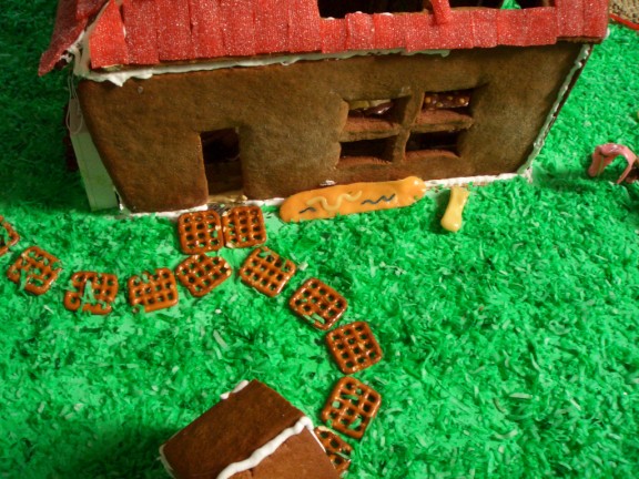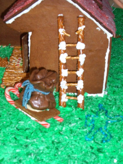 This is a new addition to our gingerbread estate. Chris the doctor decided, in his macabre sense of humor, that he needed to make a ladder leaning against the house for Santa to climb to the chimney. Sadly, Santa’s girth caused the top step to break and he fell to his death. At the right is the chalk outline that was left after the body was removed to the morgue. The sled and bag of toys remain next to the house. How will the children get their toys? Chris certainly added his touch to this year’s project!