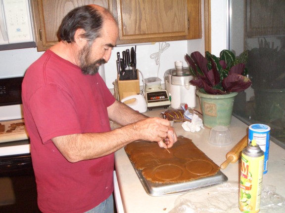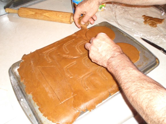 It all starts two days before with Larry mixing the gingerbread dough — a mixture that is not really edible since it has to be very stiff to bake into hard pieced — and letting it chill overnight. The dough has to be very cold or it won’t work. So, the dough is stored in the refrigerator until it is needed. Larry uses the backs of baking pans, oiled and floured and then rolls out the dough to about 1/4th inch. Then he takes the pre-drawn pieces, traces them with a knife, cuts away the excess, unused dough (back into the frig it goes), and bakes it at a very low temperature for 20-30 minutes until the pieces are rock hard. After cooling they easily come off the pan and are ready for assembly. Here he is making the parts for the merry-go-round. More on that one later.