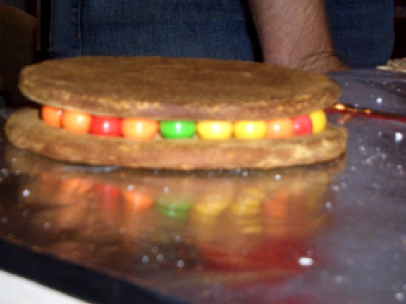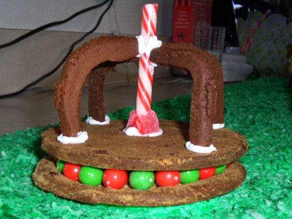 Now this is something to behold. Last year some of us watched an actual national gingerbread contest on the Food Network. One thing that struck Adam was an amazing carousel that someone made. The carousel actually turned around, propelled by two pieces of gingerbread with round gobstoppers in between to allow them to glide. Sounds simple, right? No way! Adam has to make a groove on the underside of the two pieces of gingerbread large enough to hold the gobstoppers. At the right is our version of a merry-go-round with the bars to hold onto while it twirls around. Remember being a kid and feeling like you were going to puke as the merry-go-round was slung faster and faster? I do.