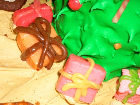 Of course no Christmas house would be complete without a decorated tree and presents. The tree is a wax paper cone covered with green icing and embedded with candy to look like ornaments. The presents are works of art with candy wrapped to look like a real gift package.