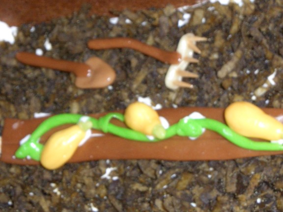 Yellow squash with a rake and shovel made by Taraneh and Camille next to them.