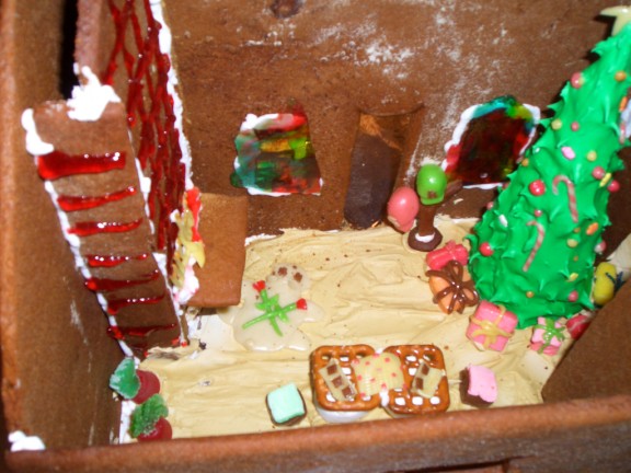 Here is an aerial view of the living room. At the left is the fireplace with a mantel which later will house a menorah (we are a nondenominational gingerbread house maker). Actually at the bottom of the fireplace there is fire which I think you can see in another photo later on. To the left of the fireplace are potted plants. In front is a polar bear skin rug (no comments on our political correctness — this was doctor Chris’ idea — he, too, is certifiable like the rest of us). on the rug are two long-stemmed roses. You can see the stained glass window, the tree and packages, a hat rack with two caps, the living room table that is in front of the couch with two side chairs. On the table is the Scrabble set mid-game.