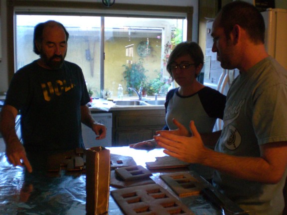 … and held up. Adam is gluing the bottoms to the board covered with foil.