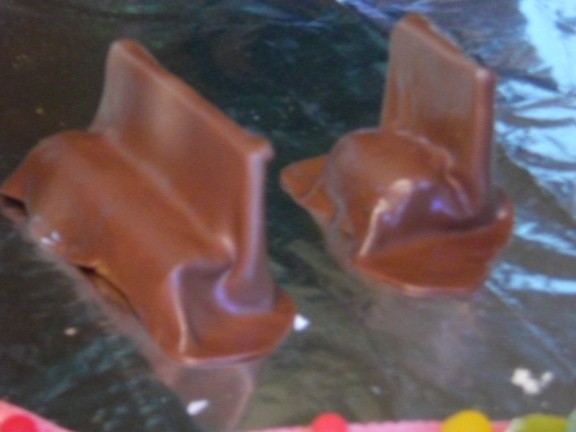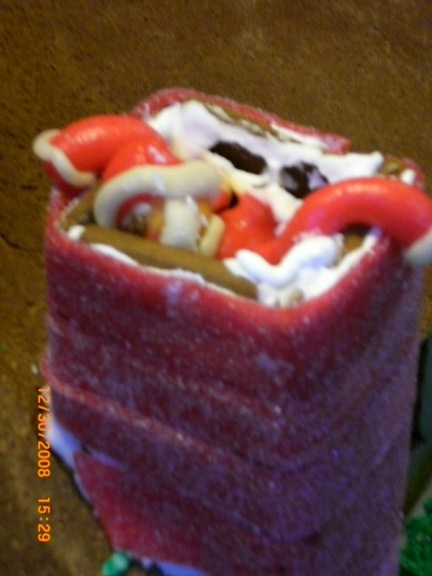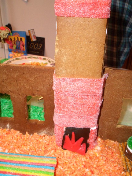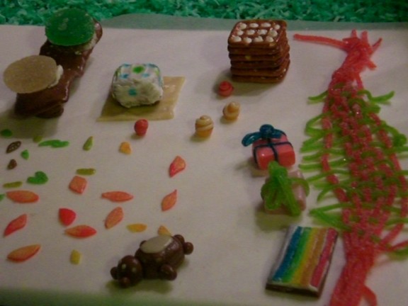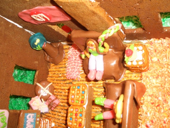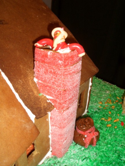 Here’s Santa sliding down the chimney. Blaire made this one. Santa’s bag of toys is below, next to the chimney. Interestingly, as often happens when you mold tootsie rolls into shapes, Santa actually did slide down the chimney and is currently stuck somewhere in the middle.