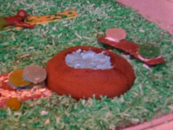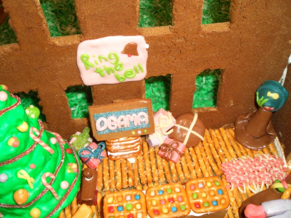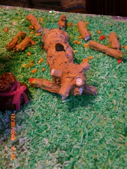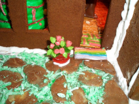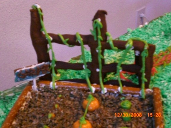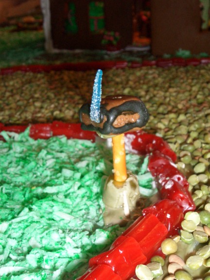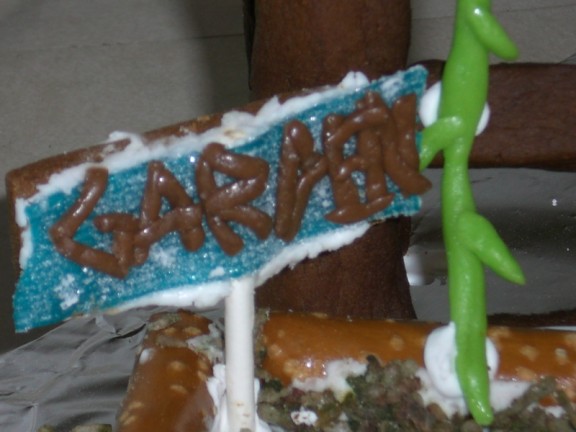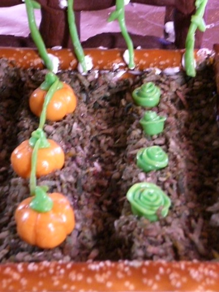 The garden has a trellis with climbing beans (the trellis is made from a single piece of baked gingerbread which collapsed later on when the hammock was strung between it and the swing set). The “dirt” is brown coconut. We had a heck of a time making brown coloring. For some reason it would come out tan or black or an awful dark, avocado green. The garden itself features a row of cabbage, another of pumpkins, and a third with carrots peeking out of the ground. Most of these were Adam’s creations with help from Farris. In the back left there is a sign letting everyone know that it is indeed a garden (Jacqueline made the sign and Farris did the lettering). In the front left is a curled hose.