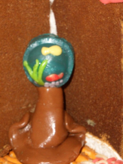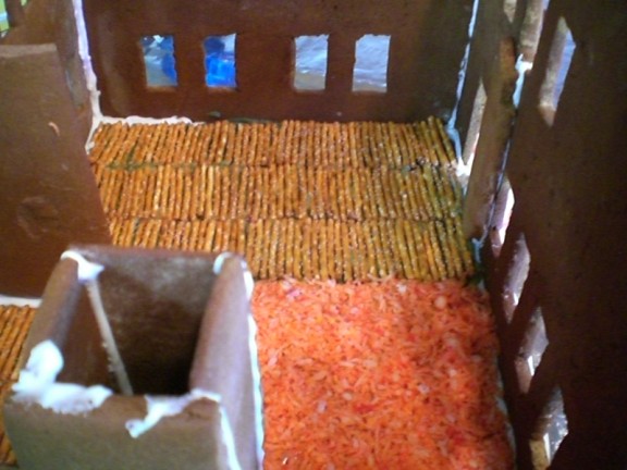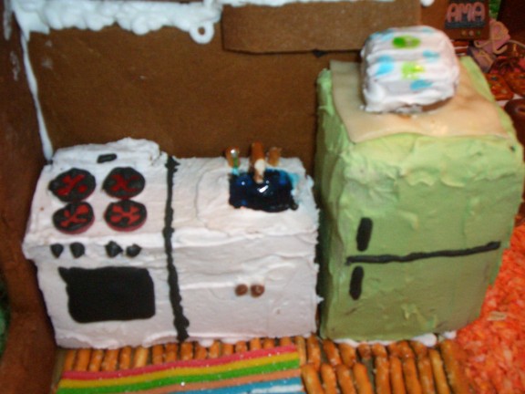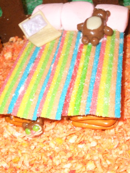 The inside of the house had two types of flooring. The pretzels formed a hardwood flooring for the living room and kitchen while the orange coconut made a shag carpet in the bedroom. The 1950s theme was continued with the avocado green refrigerator pictured earlier.