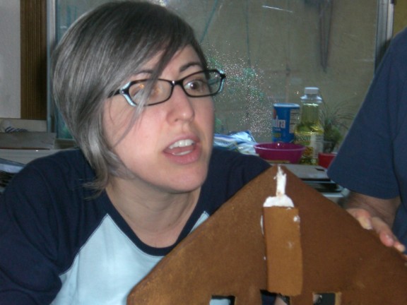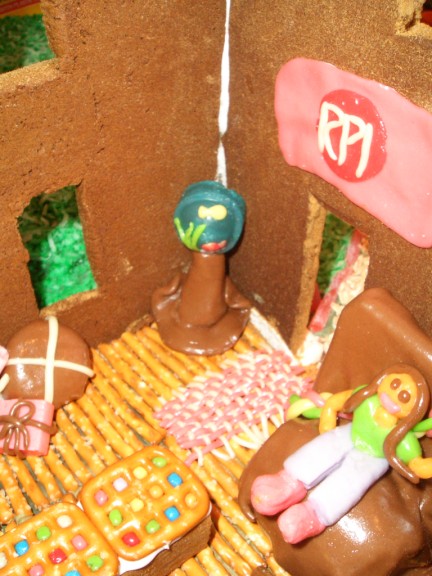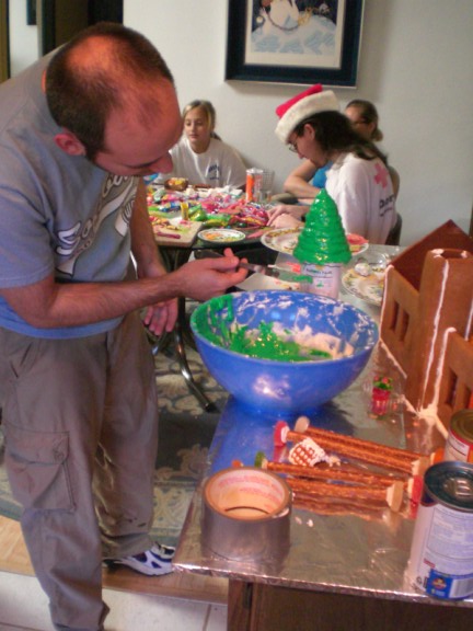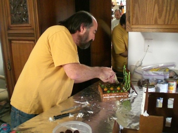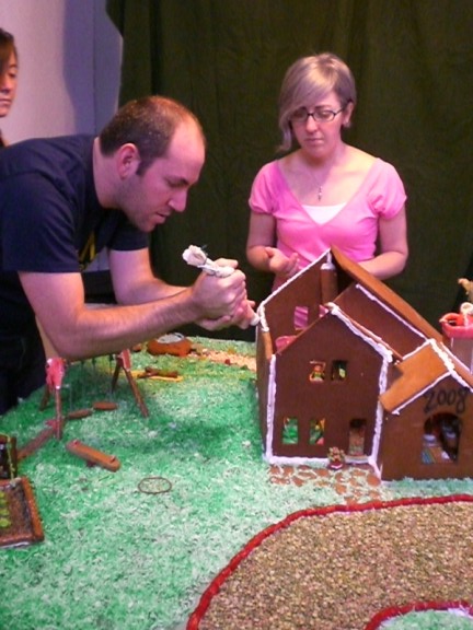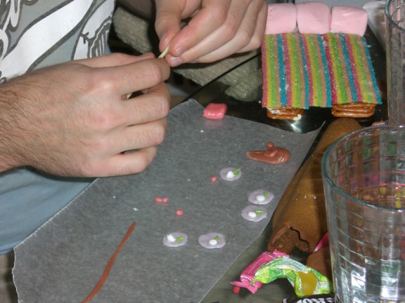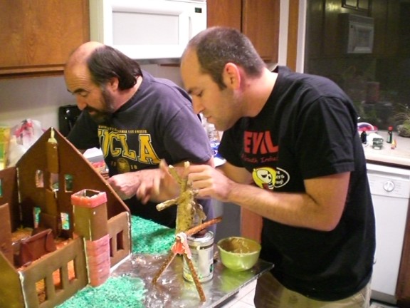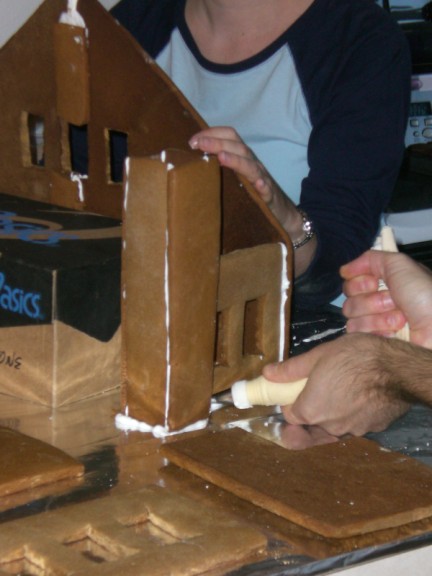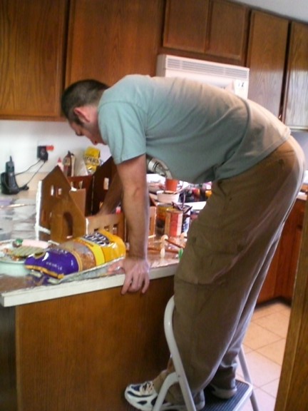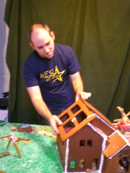 Arie is holding up the huge wall. This is one of the pieces that was too large to bake so it is in two pieces and the gingerbread piece in the middle is holding those two pieces together.