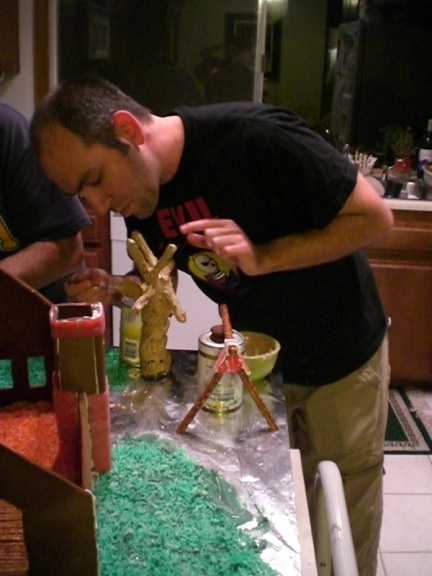 Adam is testing the roof pieces to see if they are going to fit – which they didn’t. Note the glue on the roof piece he is holding which is covering up the cracks.