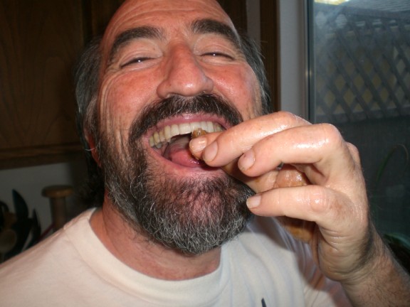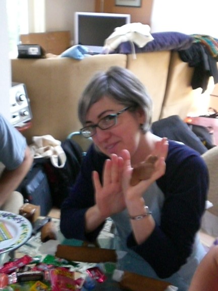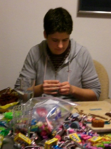 Arie is showing some of the smooshed tootsie rolls. This year we had a great time deciding where to put the tootsie rolls to warm them up so that they were pliable. The consensus was that sitting on them worked the best although Adam claimed that putting them in his pocket was better.