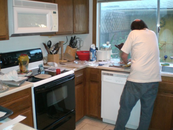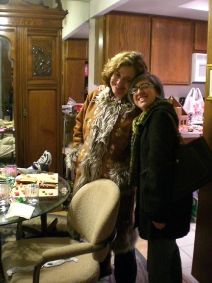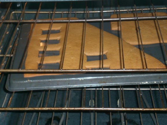 Here I am, the night before, started to bake the dough. This year Chris made the batter which is basically very stiff, dry gingerbread. You have to chill it and then take it out and roll it on the back of a baking pan. Seems simple but rolling out very cold dough takes effort. You have to roll one way a bit and then the other, all the while trying to make sure that you are keeping it about 1/4th inch thick all the way around.