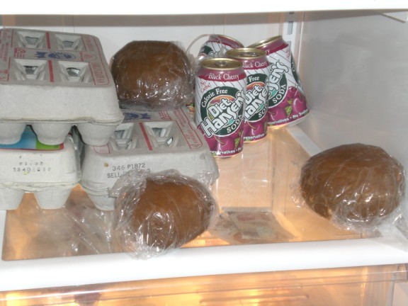Here are the balls of dough in the frig along with eggs to make the glue. The glue itself is a pound of powdered sugar, three egg whites and a tsp of cream of tartar. You have to beat it for 10 minutes to get it really thick and gooey so it dries quickly.