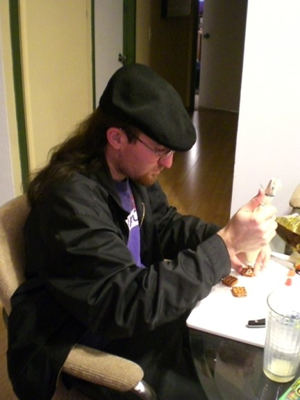 Chris is working on a coffee table to go in the dining room. He is using pretzels (the square ones with holes) and filling them with the icing.