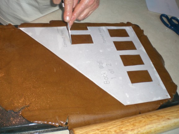 This is part of the back wall. I have rolled out the dough and now am cutting out the outline and windows.