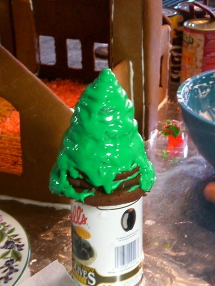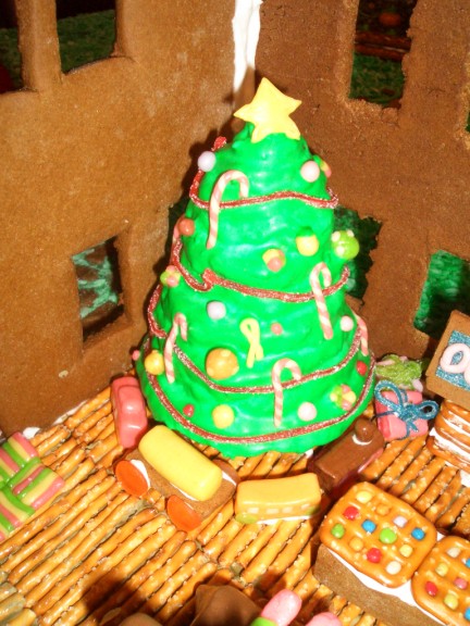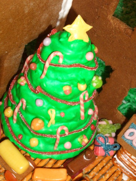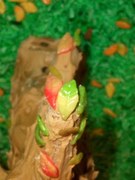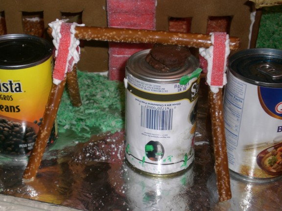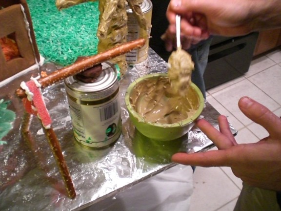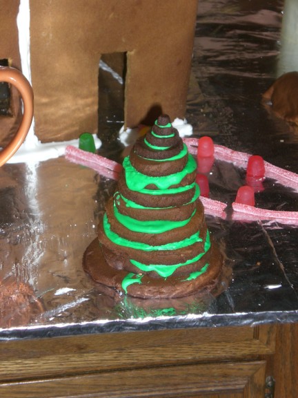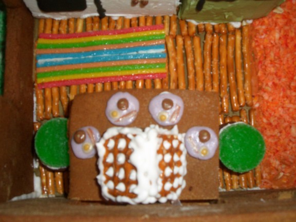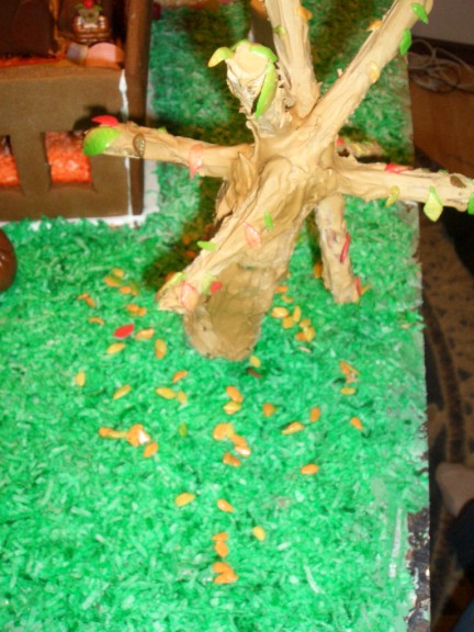 Adam’s tree was a major undertaking. I tried some ideas and none worked. He finally figured out that he could make a base with gingerbread disks glued together and coated with brown (tan?) icing and then use pretzels as the branches. Since it is the fall, a few colorful leaves remain on the tree (thanks Farris for the detailed work) and a bunch on the ground.