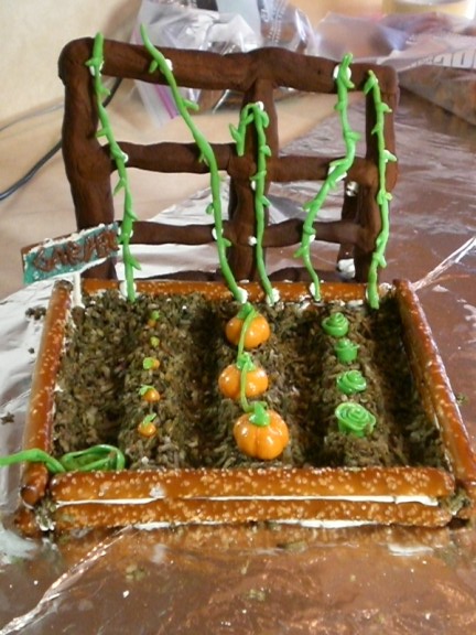 I am hard at work on my second annual garden. The outside of the raised bed is made of long, thick pretzels.