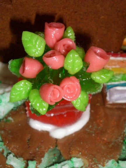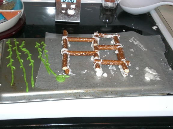 Here is a first attempt at the trellis using pretzels. As soon as I picked it up it fell apart which is why the trellis is made from gingerbread.