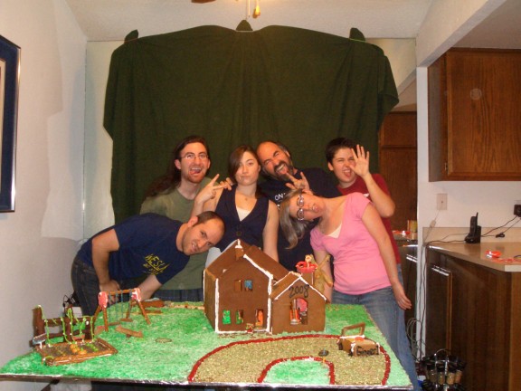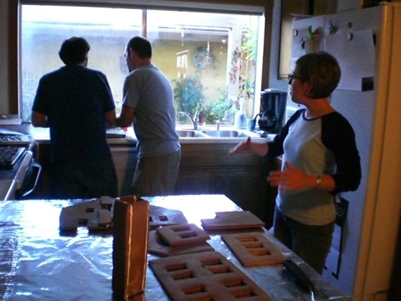 This year Adam, our chief designer, created an entirely new design which is pictured below. The design was about 50% larger than past models (luckily we do it on a 4′ x 4′ piece of plywood) and was quite intricate. The intricacies caused some structure issues which you will see below. All in all, it was still a fun experience but we were extremely exhausted even though we decided to start the house on the Saturday and Sunday before Xmas and finish it on Xmas eve (which then turned into Xmas Day). This decision to start four days earlier than usual turned out to have some problems since it was very moist in Oceanside and the pieces did not hold their baked firmness and some cracked, too. BUT, we managed to make the best of all of it and I think that the result is inspiring and next year we have copious notes on how to make it even better.