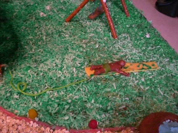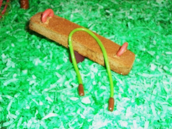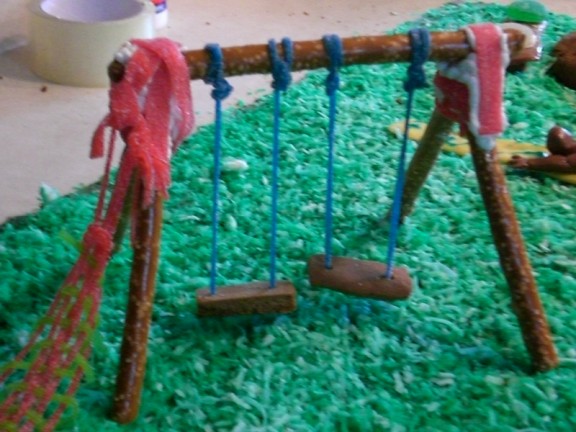 Adam is setting up the swing set. He use pretzels and strapped the pieces with rolls of sour, gummy candy rolls. Note the attempt at brown glue. This time it came out sort of tan.