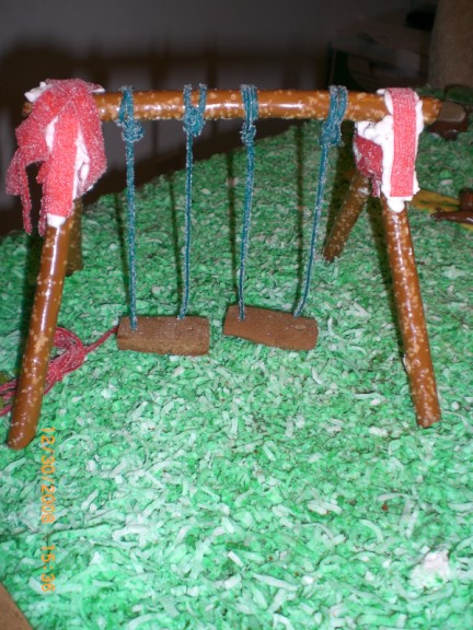 Here is the final swing set, complete with two swings suspended by strings of candy. Note the hammock to the left which is hooked to the trellis and caused the trellis to collapse.