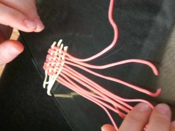 Kaylee is weaving a rug.