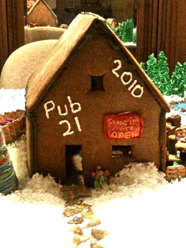 Our gingerbread house recipe is dated 1989, so this is the 21st year since the first family gingerbread house. If you have not seen earlier versions they are housed on this page. This year, in honor of “coming of age” in California, we decided to make a pub to celebrate turning 21.