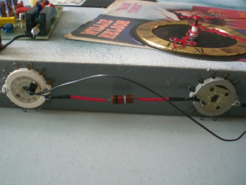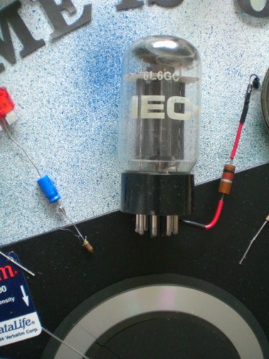 Here is a close-up of the 12 PM vacuum tube which is huge and I have connected to other parts via resisters and other similar parts.